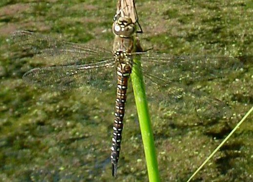ÉmergenceLe cycle larvaire de l'Aeschne mixte est très court, 7 à 9 mois en moyenne. Les larves ne passent qu'un seul hiver dans l'eau, grandissent rapidement et muent 11 fois. |