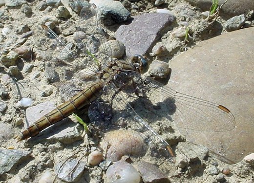 ÉmergenceLes oeufs de l'Orthétrum brun, déposés par paquets en vol à la surface de l'eau par les femelles, éclosent 4 à 5 semaines après la ponte. Les larves passent 2 ou 3 ans dans l'eau. Lors de l'émergence les larves ne s'éloignent guère de l'eau et ne grimpent pas très haut sur les plantes des berges. |