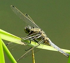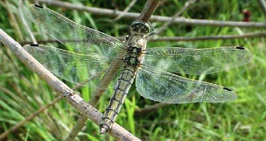 Photo : Orthétrum réticulé (Orthetrum cancellatum), femelle mature se reposant juste après avoir pondu. |