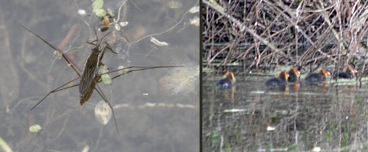 Photos : les insectes aquatiques, comme ce Gerris à gauche, sont de retour à la surface des étangs. À droite, une première nichée de foulques a été aperçue début avril. |