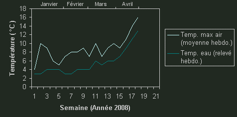 Données climatiques et durée du jourLa température de l'air est une moyenne hebdomadaire. Les données météorologiques indiquent par quelques pictogrammes la tendance des semaines. La température de l'eau est mesurée à la fin de chaque semaine, au niveau du fond, près des berges, à une profondeur de cinquante centimètres (zone de présence principale supposée des larves d'odonates). La durée du jour indiquée est celle du dernier jour de la semaine. |