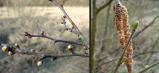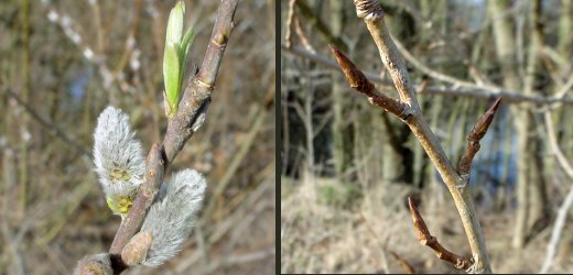 Photo : à gauche, chatons et jeunes feuilles de saule blanc. À droite, bourgeons d'Aulne glutineux début mars. |