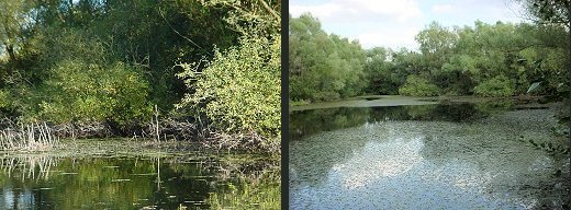 Photos : à gauche, berge typique d'étang forestier, encombrée de racines et de rejets de saule, dépourvue de ceinture d'hélophytes. À droite, autre vue d'un étang forestier nord aux berges envahies par les arbres. |
