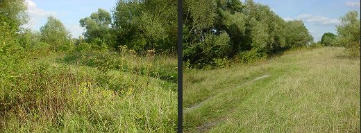 Photos : à gauche, vue du chemin en bordure de l'étang 3 au nord-est. À droite, vue du même chemin menant à la prairie à molinies (à droite au fond sur la photo). |