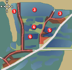 Les berges des étangs n'ont pas été prospectées entièrement pour la plupart (seuls 6 étangs nord sont accessibles, et leurs berges sont recouvertes de fourrés, de ronces et de branchages sur de vastes zones), et peu d'exuvies ont pu être collectées. L'inventaire a été essentiellement réalisé à vue, en recherchant les imagos dans les zones favorables. La nature du milieu concentrant les espèces en quelques endroits (les rares zones exposées au soleil pendant plus de quelques heures), les relevés ont principalement été effectués le long de la route de Mancourt et sur la zone arbustive au sud-ouest, ainsi que le long de la haie en bordure de l'étang 5 et sur la prairie à molinies bordant l'étang 3 au nord-est. Les observations réalisées le long des étangs sud a mis en evidence un cortège similaire d'espèces mais en effectifs nettement plus réduits. Les étangs sud ont donc été écartés de la zone d'inventaire. |