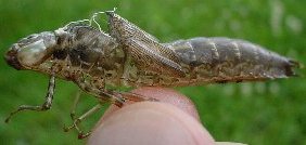 Photo : exuvie d'Anax empereur (Anax imperator), une des plus grandes espèces d'anisoptères. Ces larves vivent sur les plantes et ne sont pas couvertes de vase lorsqu'elles sortent de l'eau. |