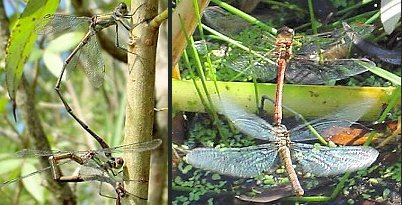 Photos : à gauche, ponte en tandem de lestes verts (Lestes viridis) sur un saule. À droite, ponte en vol de sympétrums striés (Sympetrum striolatum) au-dessus de l'eau. |