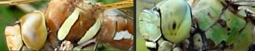 Photos : l'identification des aeschnes nécessite d'observer le thorax, notamment les bandes latérales et les bandes antéhumérales. Chez certaines espèces, la forme des taches sur l'abdomen est également caractéristique. |