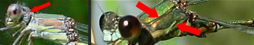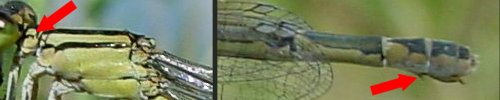 Photos : chez les agrions femelles matures, la coloration peut être bleue ou verte et le dessin des marques noires ne constitue pas un critère fiable. Il est souvent nécessaire de vérifier les bandes antéhumérales, les taches postoculaires et la forme ou le dessin du pronotum. La présence d'une épine vulvaire permet également d'identifier une espèce. |
