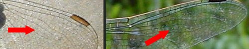 Photos : les orthétrums se différencient, pour les espèces proches, par la nervation alaire, notamment le nombre de cellules dédoublées au-dessus de la nervure radiale supplémentaire, à l'extrémité des ailes. |