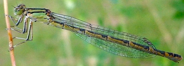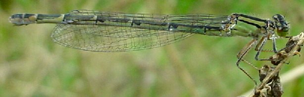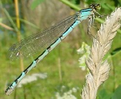 Enallagma cyathigerum, Femelles maturesLes femelles matures de l'Agrion porte-coupe (Enallagma cyathigerum) peuvent être bleues ou vertes (forme terne). Elles ressemblent beaucoup aux femelles des espèces du genre Coenagrion mais s'en distinguent par l'épine vulvaire en amont de l'ovipositeur. |