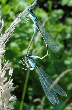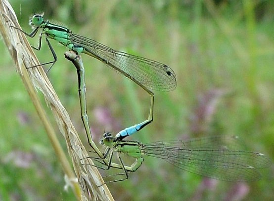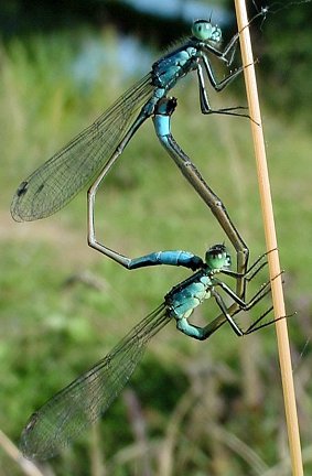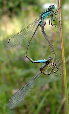 Lorsque le tandem observé comporte deux agrions élégants de coloration verte, c'est que la femelle au-dessous appartient au type vert et que le mâle au-dessus est encore immature. En général, seuls les imagos matures s'accouplent mais chez les zygoptères de tels accouplements ne sont pas rares. |