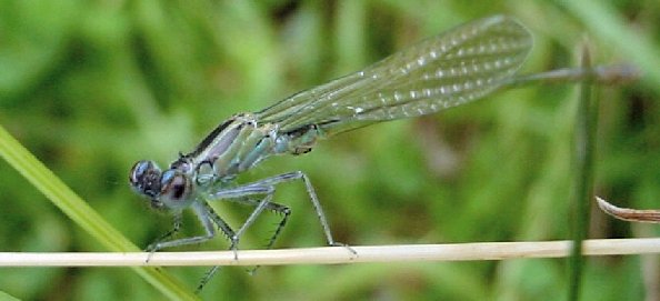 Ischnura elegans, Mâles immaturesLes mâles immatures de l'Agrion élégant (Ischnura elegans) sont verts dès l'émergence et acquièrent progressivement une coloration bleue. |