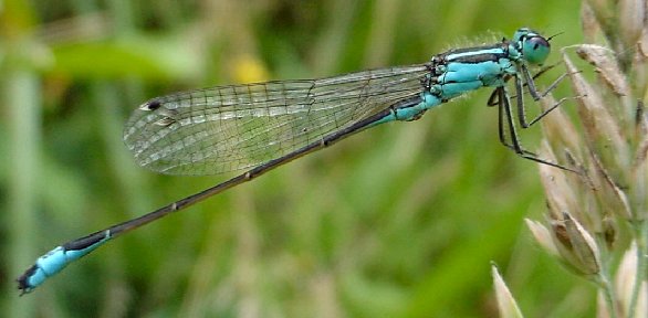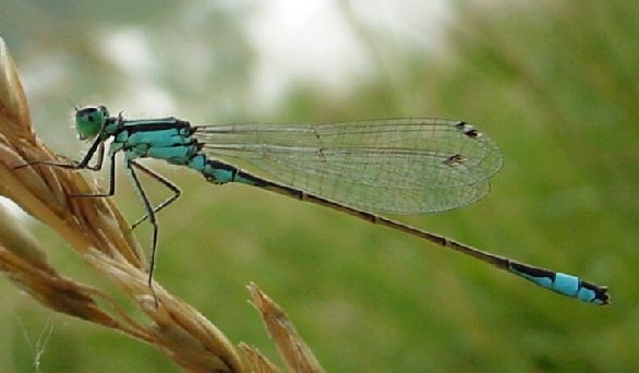 Les mâles matures de l'Agrion élégant (Ischnura elegans) présentent un thorax bleu pâle et une tache caudale bleue. Les ptérostigmas des ailes antérieures sont nettement bicolores.