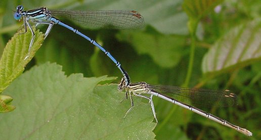 Photo : couple d'agrions à larges pattes (Platycnemis pennipes), mâle en haut, femelle en dessous. Les mâles sont toujours bleus, la coloration des femelles peut varier. |
