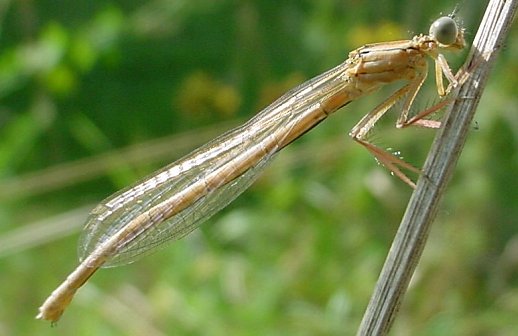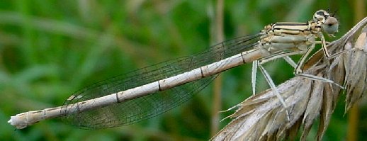 Photo : Agrion à larges pattes (Platycnemis pennipes) femelle fraîchement émergée. |