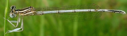 Photo : agrion à larges pattes (Platycnemis pennipes) femelle immature. Les femelles ont souvent les tibias moins larges que les mâles et l'extrémité de l'abdomen n'est que peu marqué de noir. |