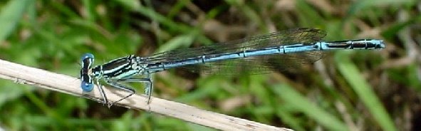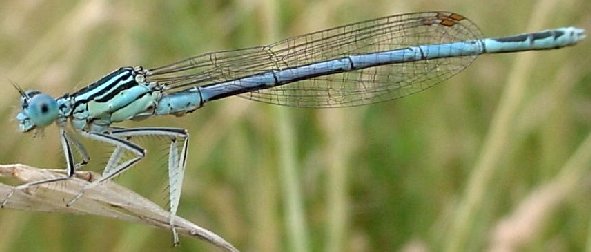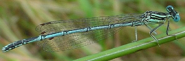 Les agrions à larges pattes (Platycnemis pennipes) mâles matures sont bleus avec des marques noires à l'extrémité de l'abdomen. L'intensité de la coloration bleue varie suivant l'âge des individus.